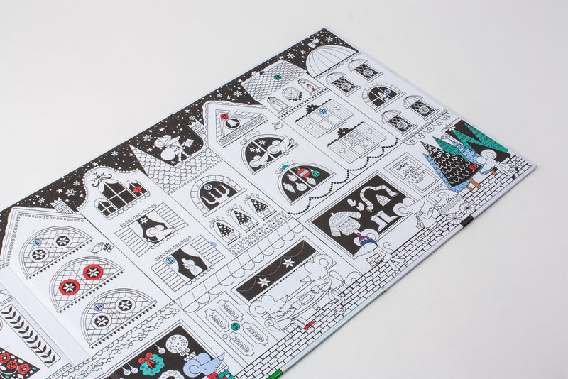 Een prachtig ontworpen, uitklapbare adventskalender om dag na dag in te kleuren terwijl kinderen aftellen naar Kerstmis. De kalender toont een zwart-wit geïllustreerd straatbeeld, met deuren en ramen om dagelijks te openen en in te kleuren, en veel vriendelijke muizen om te ontdekken. Een zwart-wit straatje dat kan worden uitgevouwen en ingekleurd. Een fantastisch, stijlvol ontworpen alternatief voor chocoladekalenders, en zet je de kalender rechtop neer, dan is dit een prachtige kerstversiering in huis. Een geweldig cadeau dat kinderen de hele decembermaand zal vermaken.