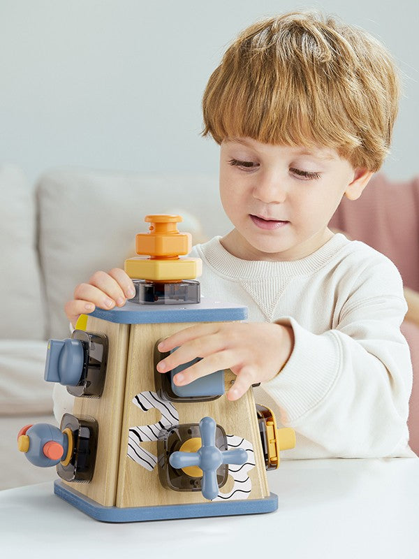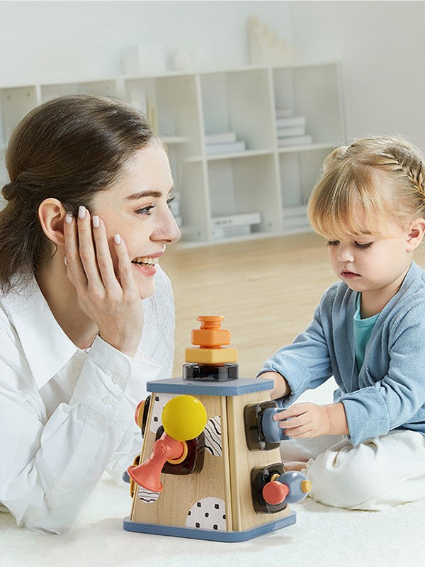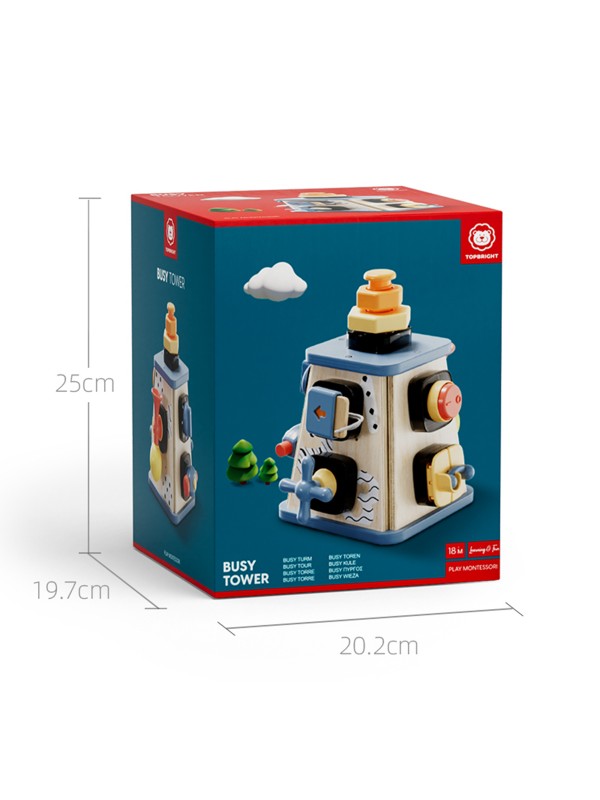 De Topbright Busy Tower is een interactieve activiteitenkubus boordevol sensorische prikkels. Peuters ontdekken aan elke zijde iets nieuws: kaartjes swipen, schakelaars omzetten, knoppen indrukken, aan schroeven draaien en nog veel meer. Elk element is ontworpen om fijne motoriek, coördinatie en het oorzaak-gevolgbegrip spelenderwijs te stimuleren.