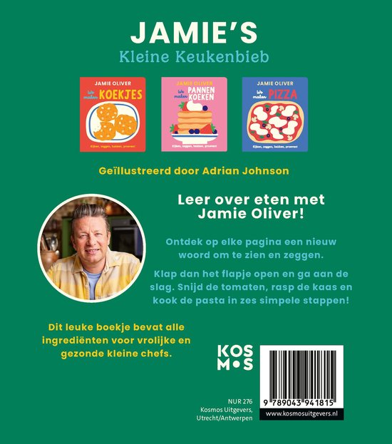 Met Jamie’s Kleine Keukenbieb ontdekken kinderen spelenderwijs de wereld van eten en koken. In vrolijke kartonboeken neemt Jamie Oliver de allerkleinsten mee in herkenbare recepten als pannenkoeken, pizza en pasta. Met flapjes, kleurrijke illustraties en stap-voor-stap uitleg leren kinderen nieuwe woorden, wordt hun nieuwsgierigheid naar eten gewekt en beleven ze plezier aan samen koken. Zo legt Jamie al jong de basis voor een gezonde relatie met voeding.