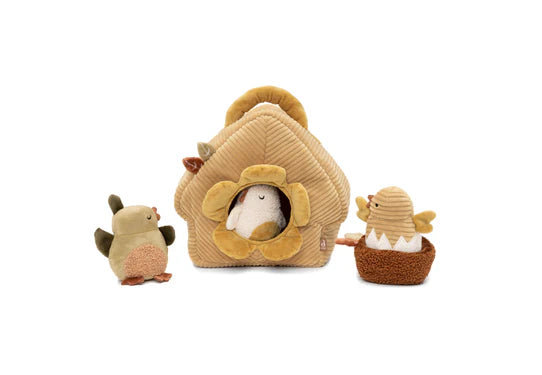 De set bevat drie schattige vogeltjes – Lulu, Chirp en Feather – die verstopt kunnen worden in een groot vogelhuis. Dit huis is prachtig versierd met blaadjes, heeft een speelse bloemenopening en een knispergeluid voor extra speelplezier. Lulu is een kleine ontdekkingsreiziger die altijd op zoek is naar een nieuw avontuur. Chirp is een vrolijke zanger die de hele dag door kleine tweets en blije geluidjes maakt. Feather is een speels vogeltje dat het liefst dansend door de lucht gaat. Dankzij het handige hengseltje neem je het vogelhuis overal mee naartoe. Een perfect (kraam)cadeau voor nieuwsgierige mini’s!