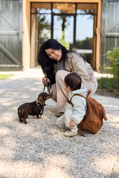 Dit schattige rugtasje Diego Dog heeft een donkerbruin kleurtje met overhangende oren. De tas heeft een rits aan de voorkant en een zachte teddy stof vooraan, met een stevige polyester mix aan de zijkanten. Binnenin zit een steekvak met velcro voor kleine spulletjes. De gespjes zorgen ervoor dat de tas goed blijft zitten. Ook de achterkant is van zachte teddy, ideaal voor naar de opvang of andere avonturen!