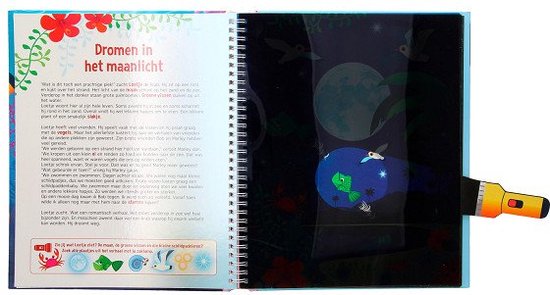 Het boek begint eerst met een educatief stuk over het onderwerp. Hier kom je ook gelijk de kartonnen zaklamp tegen. Vervolgens begint er een verhaal met dikgedrukte woorden. Deze dikgedrukte woorden staan onderaan de pagina afgebeeld. De rechterpagina is nu nog donker, maar als je de zaklamp hier achter plaatst ontstaat er een lichtbundel, net echt! Met de zaklamp kan er samen gezocht worden naar de afgebeelde dikgedrukte woorden. Zo lees je samen interactief een boek.